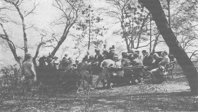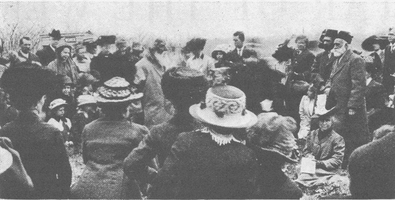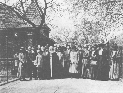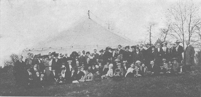 After Abdul-Baha had left for the city, the friends still lingered on, holding converse and counsel from the encircling seats within the great tent, or wandering in groups throughout the lovely grounds just breaking into the first leafage of spring. At the close a group picture was taken with the now historic Marquee tent in the background.