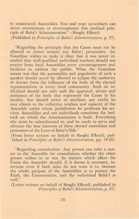 “Regarding the principle that the Cause must not be allowed to center around any Baha'i personality, the Guardian wishes to make it clear that it was never intended that well-qualified individual teachers should not receive from local Assemblies every encouragement and facilities to address the public. What the Guardian meant was that the personality and popularity of such a speaker should never be allowed to eclipse the authority or detract from the influence of the body of the elected representatives in every local community. Such an individual should not only seek the approval, advice and assistance of the body that represents the Cause in his locality, but should strive to attribute any credit he may obtain to the collective wisdom and capacity of the Assembly under whose jurisdiction he performs his services. Assemblies and not individuals constitute the bedrock on which the Administration is built. Everything else must be subordinated to, and be made to serve and advance the best interests of these elected custodians and promoters of the Laws of Baha’u lah.”