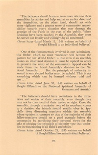 “One of the fundamentals involved in our Administrative Order, which we must remember will become the pattern for our World Order, is that even if an assembly makes an ill-advised decision it must be upheld in order to preserve the unity of the community. Appeal can be made from the Local Assembly’s decision to the National Assembly . . . But the principle of authority invested in our elected bodies must be upheld. This is not something which can be learned without trial and teste!)