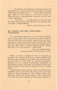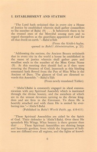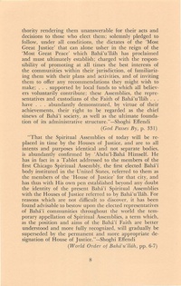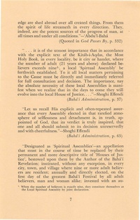 . it is of the utmost importance that in accordance with the explicit text of the Kitab-i-Aqdas, the Most Holy Book, in every locality, be it city or hamlet, where the number of adult (21 years and above) declared believers exceeds nine, a local ‘Spirtual Assembly’ be forthwith established. To it all local matters pertaining to the Cause must be directly and immediately referred for full consultation and decision. ‘The importance, nay the absolute necessity of these local Assemblies is manifest when we realize that in the days to come they will evolve into the local House of Justice. . . .-—Shoghi Effendi