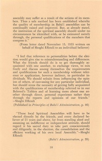 “I feel that reference to personalities before the election would give rise to misunderstanding and differences. What the friends should do is to get thoroughly acquainted with one another, to exchange views, to mix freely and discuss among themselves the requirements and qualifications for such a membership without reference or application, however indirect, to particular individuals. We should refrain from influencing the opinion of others, of canvassing for any particular individual, but should stress the necessity of getting fully acquainted with the qualifications of membership referred to in our Beloved’s Tablets and of learning more about one another through direct, personal experience rather than through the reports and opinions of our friends.” —Shoghi Effendi