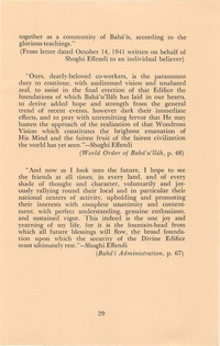 “And now as I look into the future, I hope to see the friends at all times, in every land, and of every shade of thought and character, voluntarily and joyously rallying round their local and in particular their national centers of activity, upholding and promoting their interests with complete unanimity and contentment, with perfect understanding, genuine enthusiasm, and sustained vigor. This indeed is the one joy and yearning of my life, for it is the fountain-head from which all future blessings will flow, the broad foundation upon which the security of the Divine Edifice must ultimately rest.’’—Shoghi Effendi