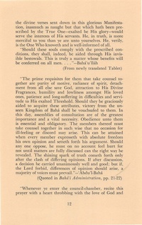 “The prime requisites for them that take counsel together are purity of motive, radiance of spirit, detachment from all else save God, attraction to His Divine Fragrances, humility and lowliness amongst His loved ones, patience and long-suffering in difficulties and servitude to His exalted Threshold. Should they be graciously aided to acquire these attributes, victory from the unseen Kingdom of Baha shall be vouchsafed to them. In this day, assemblies of consultation are of the greatest importance and a vital necessity. Obedience unto them is essential and obligatory. The members thereof must take counsel together in such wise that no occasion for ill-feeling or discord may arise. This can be attained when every member expresseth with absolute freedom his own opinion and setteth forth his argument. Should any one oppose, he must on no account feel hurt for not until matters are fully discussed can the right way be revealed. The shining spark of truth cometh forth only after the clash of differing opinions. If after discussion, a decision be carried unanimously well and good; but if, the Lord forbid, differences of opinion should arise, a majority of voices must prevail.” —‘Abdu’l-Baha