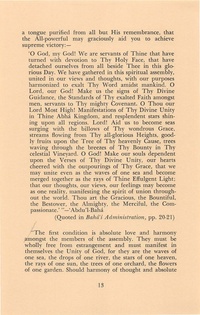 ‘O God, my God! We are servants of Thine that have turned with devotion to Thy Holy Face, that have detached ourselves from all beside Thee in this glorious Day. We have gathered in this spiritual assembly, united in our views and thoughts, with our purposes harmonized to exalt Thy Word amidst mankind. O Lord, our God! Make us the signs of Thy Divine Guidance, the Standards of Thy exalted Faith amongst men, servants to Thy mighty Covenant. O Thou our Lord Most High! Manifestations of Thy Divine Unity in Thine Abha Kingdom, and resplendent stars shining upon all regions. Lord! Aid us to become seas surging with the billows of Thy wondrous Grace, streams flowing from Thy all-glorious Heights, goodly fruits upon the Tree of Thy heavenly Cause, trees waving through the breezes of Thy Bounty in Thy celestial Vineyard. O God! Make our souls dependent upon the Verses of Thy Divine Unity, our hearts cheered with the outpourings of Thy Grace, that we may unite even as the waves of one sea and become merged together as the rays of Thine Effulgent Light; that our thoughts, our views, our feelings may become as one reality, manifesting the spirit of union throughout the world. Thou art the Gracious, the Bountiful, the Bestower, the Almighty, the Merciful, the Compassionate.’ ’—‘Abdu’]l-Baha