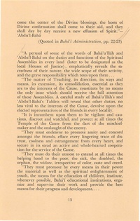 “The matter of Teaching, its direction, its ways and means, its extension, its consolidation, essential as they are to the interests of the Cause, constitute by no means the only issue which should receive the full attention of these Assemblies. A careful study of Baha’u’llah’s and ‘Abdu'l-Baha’s Tablets will reveal that other duties, no less vital to the interests of the Cause, devolve upon the elected representatives of the friends in every locality.