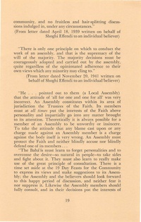 “But before the majority of the Assembly comes to a decision, it is not only the right but the sacred obligation of every member to express freely and openly his views, without being afraid of displeasing or alienating any of his fellow-members. In view of this important administrative principle of frank and open consultation, the Guardian would advise you to give up the method of asking other members to voice your opinion and suggestions. This indirect way of expressing your views to the Assembly not only creates an atmosphere of secrecy which is most alien to the spirit of the Cause, but would also lead to many misunderstandings and complications. The assembly members must have the courage of their convictions but must also express whole-hearted and unqualified obedience to the well-considered judgment and directions of the majority of their fellowmembers.”