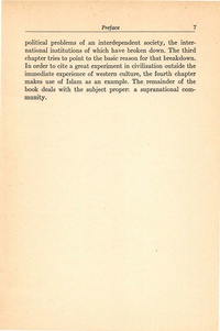 political problems of an interdependent society, the international institutions of which have broken down. The third chapter tries to point to the basic reason for that breakdown. In order to cite a great experiment in civilization outside the immediate experience of western culture, the fourth chapter makes use of Islam as an example. The remainder of the book deals with the subject proper: a supranational community.