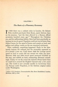 N 1834 there was a cabinet crisis in London. Sir Robert Peel, recalled post-haste from Rome, spent thirteen days on the journey, “just the time allowed to a Roman official seventeen hundred years ago.”? Throughout the Christian era, and for millenniums before, there had been practically no increase in travel-speed. Napoleon could not travel faster than Julius Caesar, for the speed of horses and camels on land, and galleys and sailing vessels on the sea remained stationary. Then, suddenly, something happened. Early in the nineteenth century the railroad and the steamship appeared as if to herald a new era. Until about 1840 the average travel speed on land or water did not exceed ten miles per hour. Between 1840 and 1924 travel speed increased fourfold on the seas, and sixfold on land, contracting distances accordingly. Today we can fly across the Atlantic Ocean faster than we could have crossed the English Channel only a few years ago. The world is now actually smaller in travel-time than was Europe under Napoleon, or the thirteen original states under Washington.