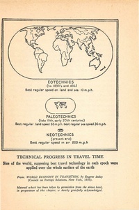 TECHNICAL PROGRESS IN TRAVEL TIME Size of the world, supposing best travel technology in each epoch were applied over the whole surface of the earth