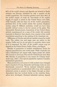 80% of the world’s known coal deposits are located in North America and Europe, inhabited by only a quarter of the world’s population. Six countries produce more than 90% of the world’s supply of crude oil. Two-thirds of the world’s supply of copper is mined in the United States and Chile, while Canada, with less than 1% of the world’s population, produces 85% of the world’s nickel. Our modern telephone system, using 37 different materials, would not have been possible without access to the far corners of the globe. The Automobile Manuiacturers Association of the United States printed, superimposed on a map of the world, 183 essential materials to illustrate that almost every country of the world contributed something to the making of the American car.