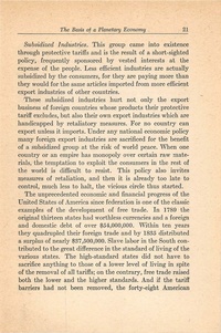 ‘These subsidized industries hurt not. only the export business of foreign countries whose products their protective tariff excludes, but also their own export industries which are handicapped by retaliatory measures. For no country can export unless it imports. Under any national economic policy many foreign export industries are sacrificed for the benefit of a subsidized group at the risk of world peace. When one country or an empire has monopoly over certain raw materials, the temptation to exploit the consumers in the rest of the world is difficult to resist. This policy also invites measures of retaliation, and then it is already too late to control, much less to halt, the vicious circle thus started.