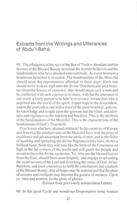 95. The effulgence of the rays of the Sun of Truth is abundant and the favours of the Blessed Beauty surround the women believers and the handmaidens who have attained unto certitude. At every moment a bounteous bestowal is revealed. The handmaidens of the Merciful should seize the opportunities afforded in these days. Each one should strive to draw nigh unto the divine Threshold and seek bounties from the Source of existence. She should attain such a state and be confirmed with such a power as to make, with but the utterance of one word, a lowly person to be held in reverence, initiate him who is deprived into the world of the spirit, impart hope to the despondent, endow the portionless one with a share of the great bestowal, and confer knowledge and insight upon the ignorant and the blind, and alertness and vigilance on the indolent and heedless. This is the attribute of the handmaidens of the Merciful. This is the characteristic of the bondsmaids of God's Threshold.
