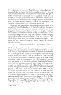 94. We beseech the True One to adorn His handmaidens with the ornament of chastity, of trustworthiness, of righteousness and of purity. Verily, He is the All-Bestowing, the All-Generous. We make mention of the handmaidens of God at this time and announce unto them the glad-tidings of the tokens of the mercy and compassion of God and His consideration for them, glorified be He, and We supplicate Him for all His assistance to perform such deeds as are the cause of the exaltation of His Word. He verily speaketh the truth and enjoineth upon His servants and His handmaidens that which will profit them in every world of His worlds. He, verily, is the All-Forgiving, the All-Merciful.