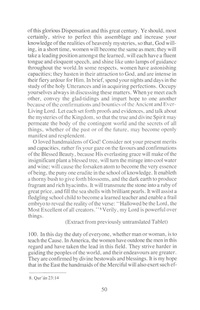 O virtuous leaf, O teacher of the Cause! Now is the time to speak forth and to deliver speeches, the time to teach and to give testimony. Loosen thy tongue, expound the truths, and establish the validity of the verse: "The All-Merciful hath taught the Qur'an."9 The Holy Spirit speaketh through the inner-most essence of the human tongue, God's Spirit which desireth communion with the human soul unfoldeth the truths, the Faithful Spirit writeth down and the Spirit of the Ancient of Days confirmeth. I swear by that Peerless Beauty, Who is in the Unseen Kingdom, that when the leaves loose their tongues in praise and glorification of the All-Loving Lord, and in teaching the Cause of the Kind Lord, the concourse of the Kingdom and the inmates of the Unseen Realms will give ear, and cry out with exclamations of extreme joy and jubilation. Glory be upon thee and upon every handmaiden who is steadfast in the Covenant. (Extract from previously untranslated Tablet)