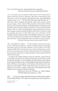 O handmaid of God!... To the mothers must be given the divine Teachings and effective counsel, and they must be encouraged and made eager to train their children, for the mother is the first educator of the child. It is she who must, at the very beginning, suckle the new-born at the breast of God's Faith and God's Law, that divine love may enter into him even with his mother's milk, and be with him till his final breath.