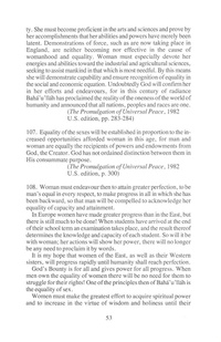 107. Equality of the sexes will be established in proportion to the increased opportunities afforded woman in this age, for man and woman are equally the recipients of powers and endowments from God, the Creator. God has not ordained distinction between them in His consummate purpose. (The Promulgation of Universal Peace, 1982 U.S. edition, p. 300)