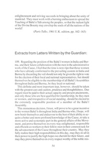 109. Regarding the position of the Bahá’í women in India and Burma, and their future collaboration with the men in the administrative work of the Cause, I feel that the time is now ripe that those women who have already conformed to the prevailing custom in India and Burma by discarding the veil should not only be given the right to vote for the election of their local and national representatives, but should themselves be eligible to the membership of all Bahá’í Assemblies throughout India and Burma, be they local or national.