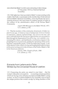 110. Full rights have been accorded to Bahá’í women residing in the cradle of the Faith, to participate in the membership of both national and local Bahá’í Spiritual Assemblies, removing thereby the last re- maining obstacle to the enjoyment of complete equality of rights in the conduct of the administrative affairs of the Persian Bahá’í Community. (April 1954 Messages to the Bahá’í World, 1971 U.S. edition, p. 65)