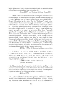 113. ‘Abdu’l-Bahá has pointed out that "Among the miracles which distinguish this sacred Dispensation is this, that women have evinced a greater boldness than men when enlisted in the ranks of the Faith." Shoghi Effendi has further stated that this "boldness" must, in the course of time, "be more convincingly demonstrated, and win for the beloved Cause victories more stirring than any it has as yet achieved." Although obviously the entire Bahá’í world is committed to encouraging and stimulating the vital rôle of women in the Bahá’í community as well as in society at large, the Five Year Plan calls specifically on eighty National Spiritual Assemblies to organize Bahá’í activities for women. In the course of the current year which has been designated "International Women's Year" as a world-wide activity of the United Nations, the Bahá’ís, particularly in these eighty national communities, should initiate and implement programs which will stimulate and promote the full and equal participation of women in all aspects of Bahá’í community life, so that through their accomplishments the friends will demonstrate the distinction of the Cause of God in this field of human endeavour. (25 May 1975 to all National Spiritual Assemblies)