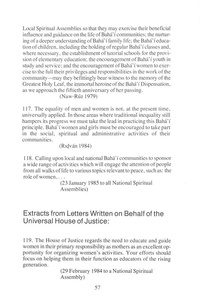 Local Spiritual Assemblies so that they may exercise their beneficial influence and guidance on the life of Bahá’í communities; the nurturing of a deeper understanding of Bahá’í family life; the Bahá’í education of children, including the holding of regular Bahá’í classes and, where necessary, the establishment of tutorial schools for the provision of elementary education; the encouragement of Bahá’í youth in study and service; and the encouragement of Bahá’í women to exercise to the full their privileges and responsibilities in the work of the community—may they befittingly bear witness to the memory of the Greatest Holy Leaf, the immortal heroine of the Bahá’í Dispensation, as we approach the fiftieth anniversary of her passing.